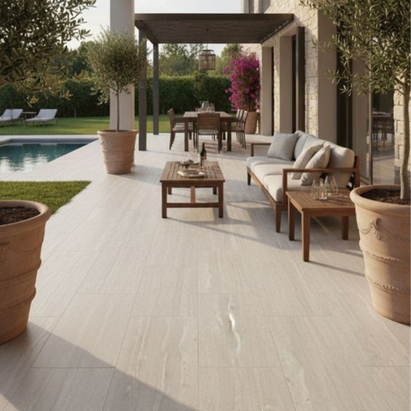 Gres Porcellanato da esterno effetto marmo travertino , bordi rettificati, R11 antiscivolo, superficie naturale.