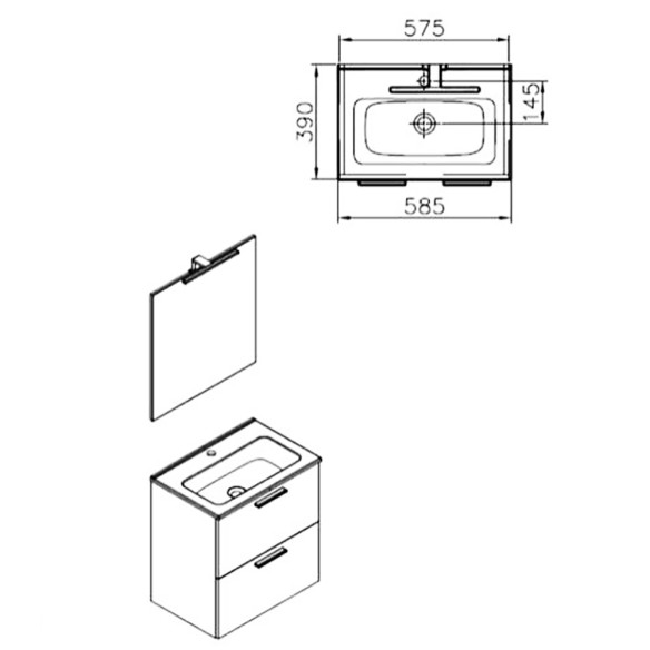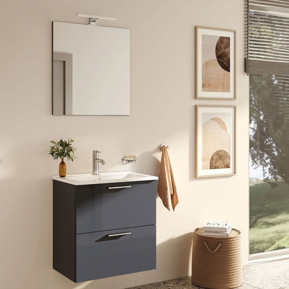 Composione mobile con due cassetti compreso di lavabo in ceramica,specchio con applique, finitura antracite opaco. N.B.: I RUBINETTI NON SONO INCLUSI