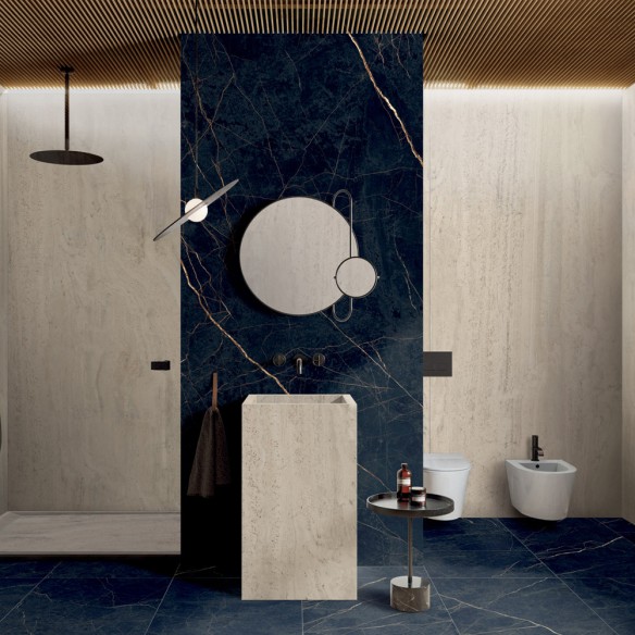 Piastrella in gres porcellanato, effetto marmo, pavimenti e rivestimenti interni, bordi rettificati, superficie soft naturale. Made in Italy.